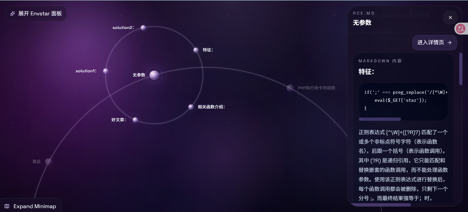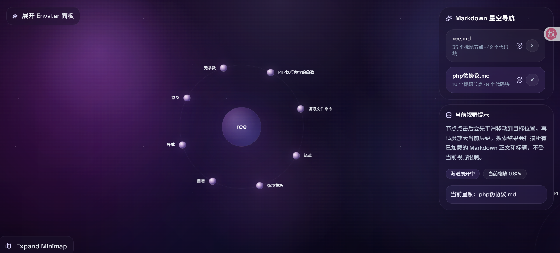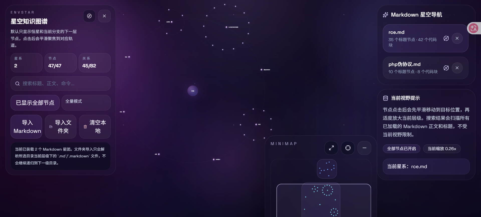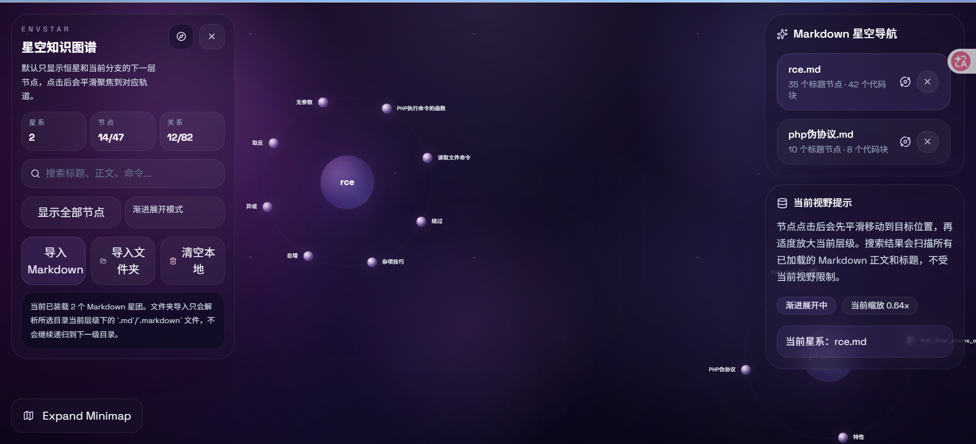 内置了一个rce.md,是我用来做测试的,右边可以直接叉掉然后导入自己的笔记,导入方式有两种,一种是一个一个的导入,另一种是直接一次性导入某个文件夹里面的所有md文件,因为可能有很多的笔记是分开的放在一个文件夹里面,一个一个导入很麻烦.