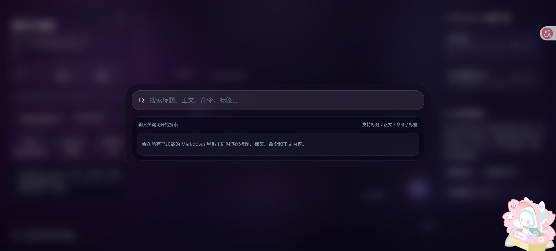 点击左边的搜索按钮会出现一个全屏的搜索框出来,支持搜索当前页面加载的所有md关键字