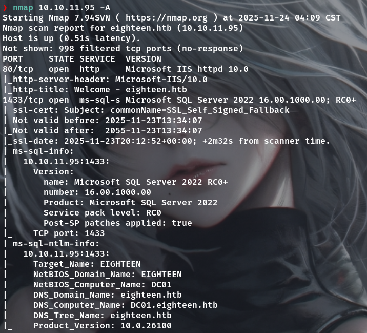 echo "10.10.11.95 eighteen.htb DC01.eighteen.htb" >> /etc/hostsNmap