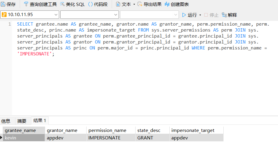 不过发现没有权限看数据库里面的东西,这里kevin用户有IMPERSONATE权限可以继承appdev用户