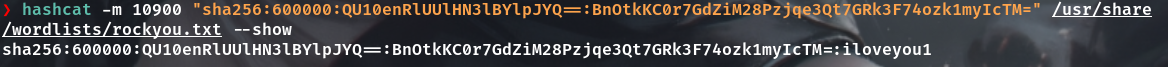 hashcat -m 10900 "sha256:600000:QU10enRlUUlHN3lBYlpJYQ==:BnOtkKC0r7GdZiM28Pzjqe3Qt7GRk3F74ozk1myIcTM=" /usr/share/wordlists/rockyou.txt