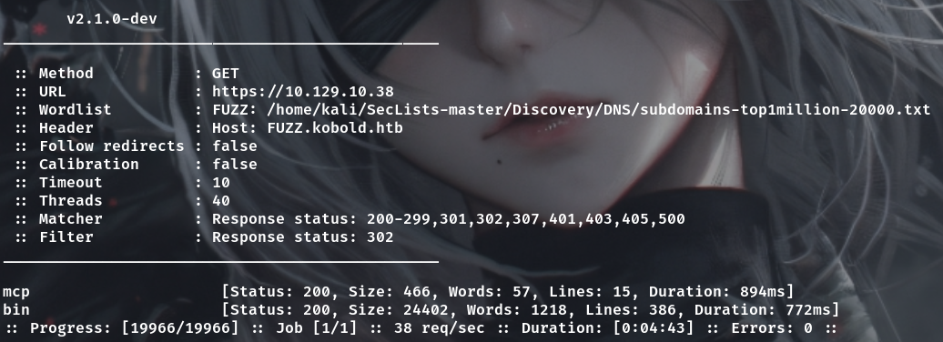 ffuf -w SecLists-master/Discovery/DNS/subdomains-top1million-20000.txt -u https://kobold.htb -H "Host: FUZZ.kobold.htb" -fc 302