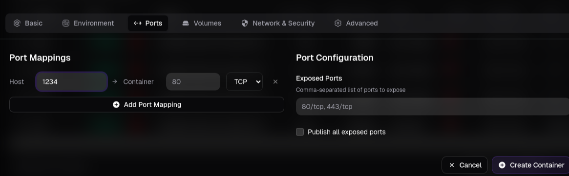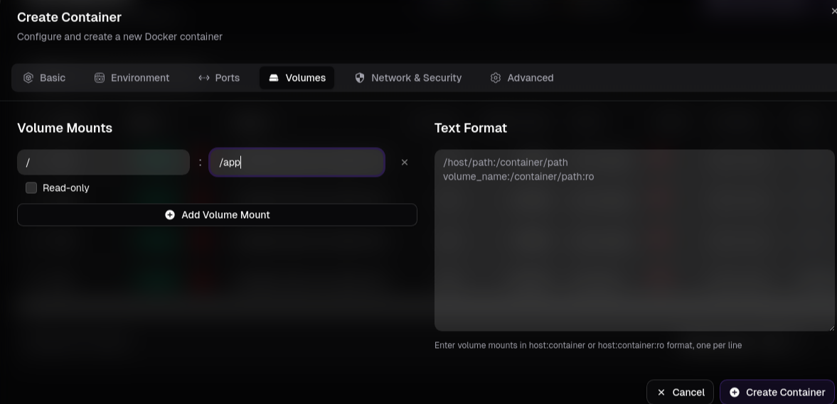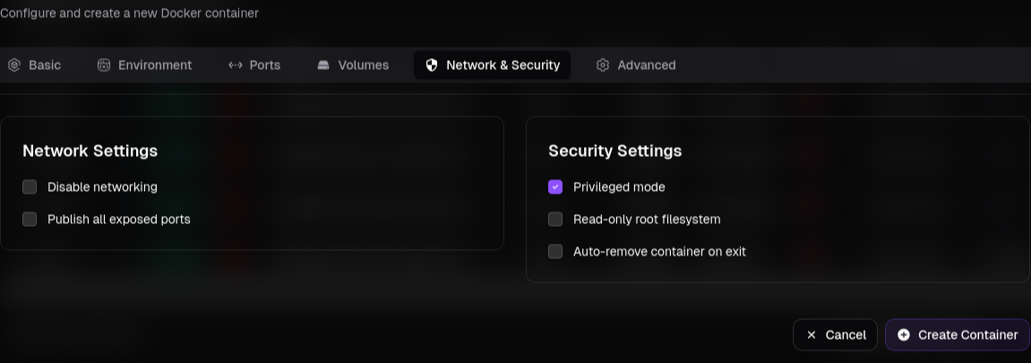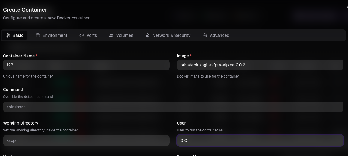 登录后创建新容器,这里注意镜像需要用已有的,可以直接抄现成的容器镜像名。然后下面的user那个需要0:0 代表root用户运行这个docker