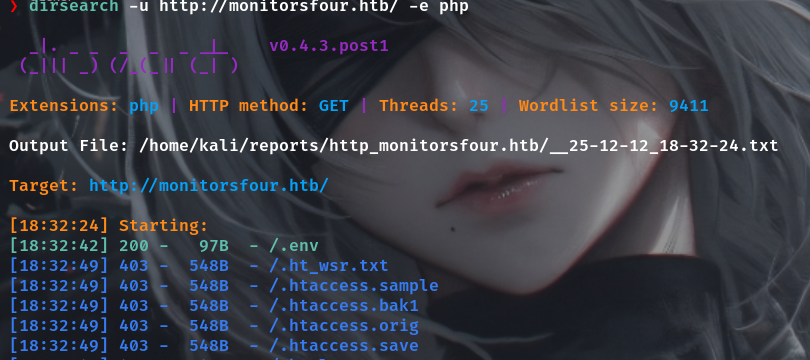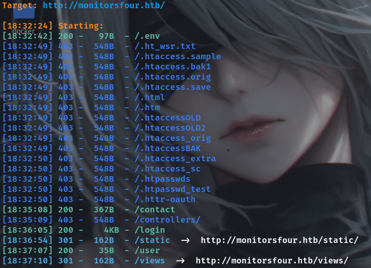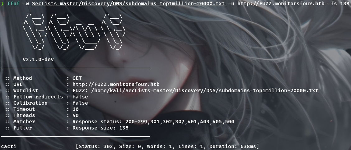ffuf -w SecLists-master/Discovery/DNS/subdomains-top1million-20000.txt -u http://FUZZ.monitorsfour.htb -fs 138