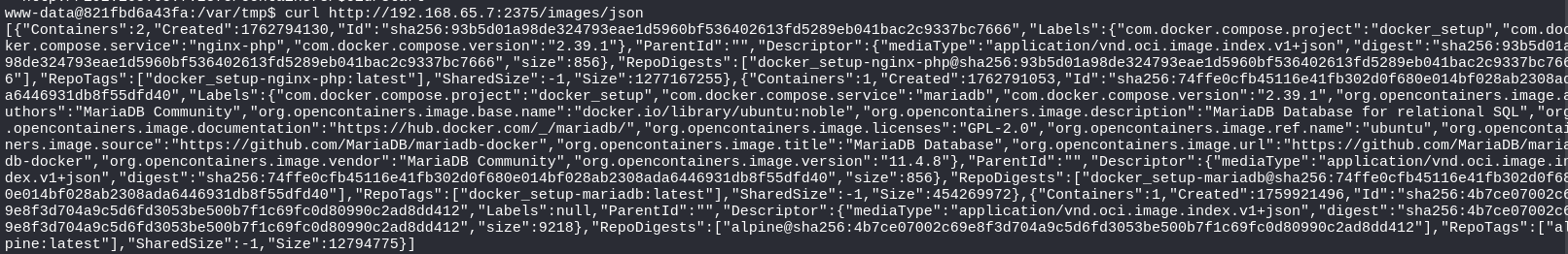 通过执行curl http://192.168.65.7:2375/images/json 可以发现已有的镜像,可以随便找一个有bash的,比如说docker_setup-nginx-php:latest