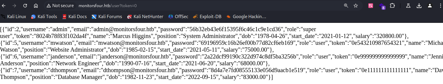 [{"id":2,"username":"admin","email":"admin@monitorsfour.htb","password":"56b32eb43e6f15395f6c46c1c9e1cd36","role":"super user","token":"8024b78f83f102da4f","name":"Marcus Higgins","position":"System Administrator","dob":"1978-04-26","start_date":"2021-01-12","salary":"320800.00"},{"id":5,"username":"mwatson","email":"mwatson@monitorsfour.htb","password":"69196959c16b26ef00b77d82cf6eb169","role":"user","token":"0e543210987654321","name":"Michael Watson","position":"Website Administrator","dob":"1985-02-15","start_date":"2021-05-11","salary":"75000.00"},{"id":6,"username":"janderson","email":"janderson@monitorsfour.htb","password":"2a22dcf99190c322d974c8df5ba3256b","role":"user","token":"0e999999999999999","name":"Jennifer Anderson","position":"Network Engineer","dob":"1990-07-16","start_date":"2021-06-20","salary":"68000.00"},{"id":7,"username":"dthompson","email":"dthompson@monitorsfour.htb","password":"8d4a7e7fd08555133e056d9aacb1e519","role":"user","token":"0e111111111111111","name":"David Thompson","position":"Database Manager","dob":"1982-11-23","start_date":"2022-09-15","salary":"83000.00"}]测试发现0以及0e后面跟任何数字即可触发这个