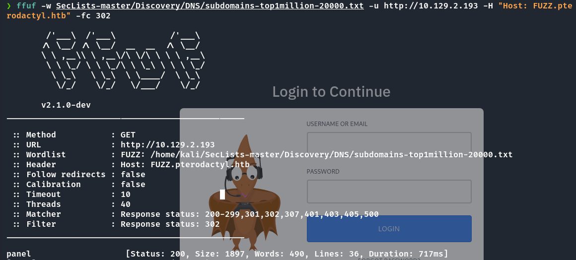 ffuf -w SecLists-master/Discovery/DNS/subdomains-top1million-20000.txt -u http://10.129.2.193 -H "Host: FUZZ.pterodactyl.htb" -fc 302