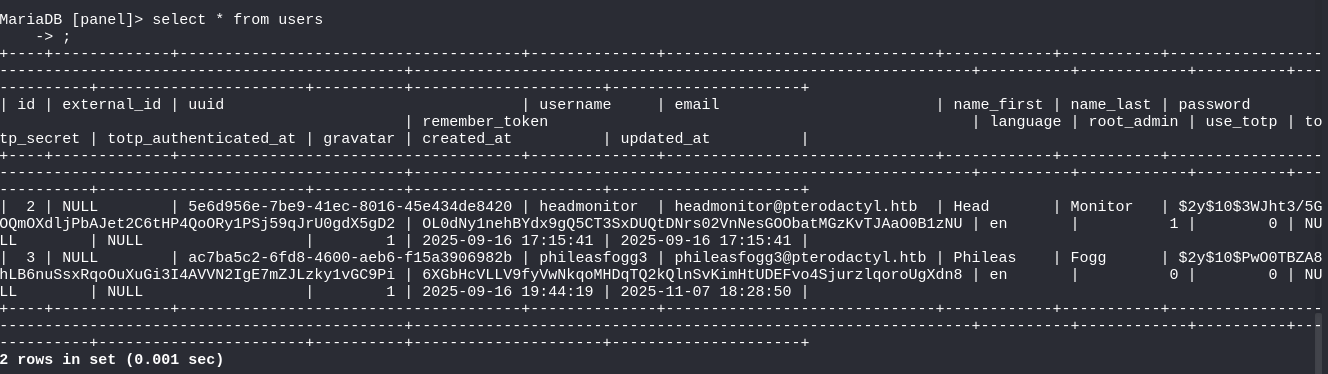 mysql -h 127.0.0.1 -u pterodactyl -p 'panel'