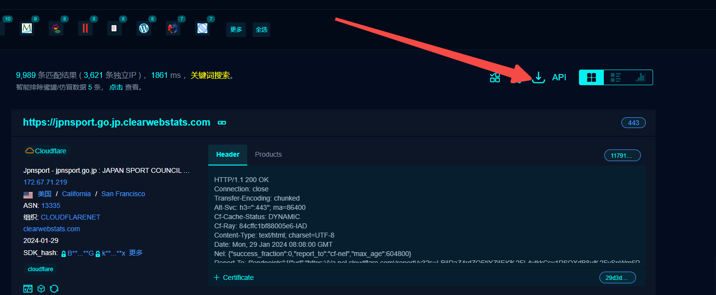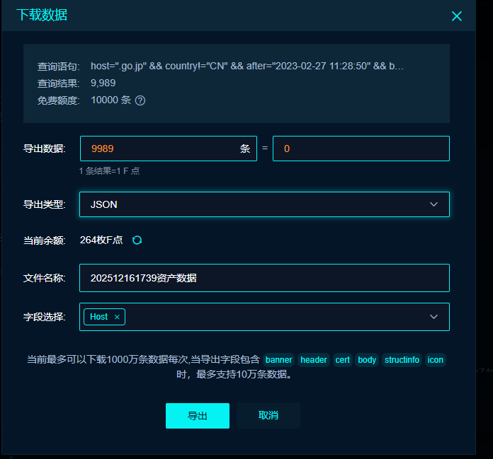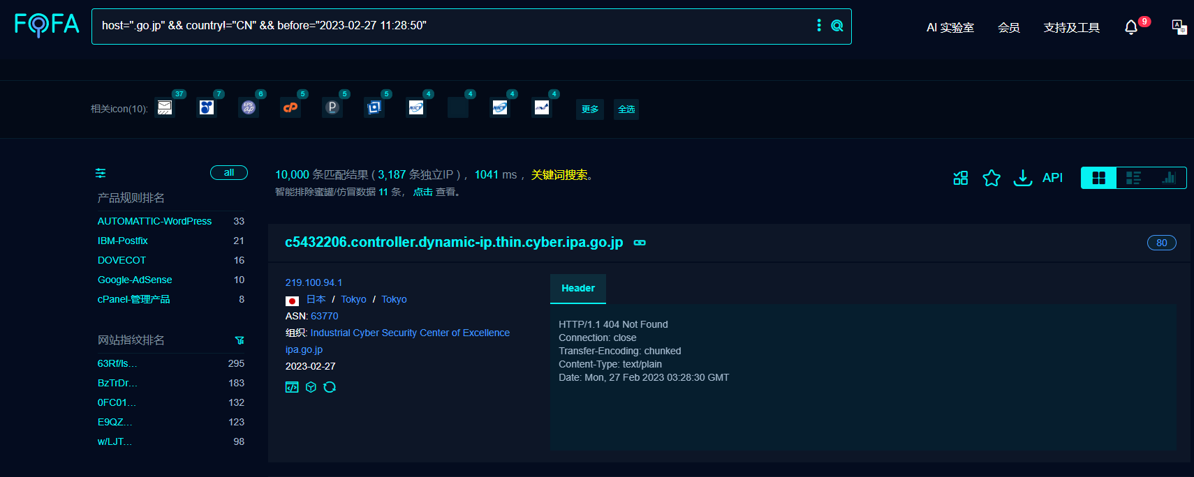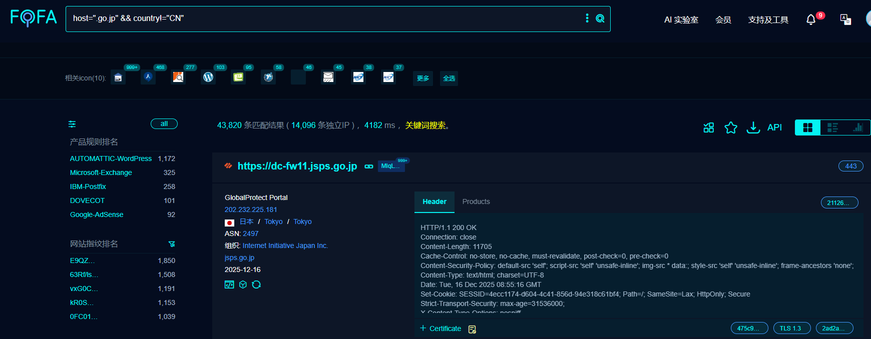 假设我们要扫描指定资产,这个资产有很多,但是你只有一个限制一万条的fofa账号,比如说日本的gov,通常会在fofa搜索