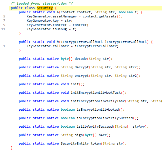 4、还有就是感觉厂商有可能会将so文件直接命名为java层的类,比如这里的Security类,就直接命名为libsecurity也是有可能的