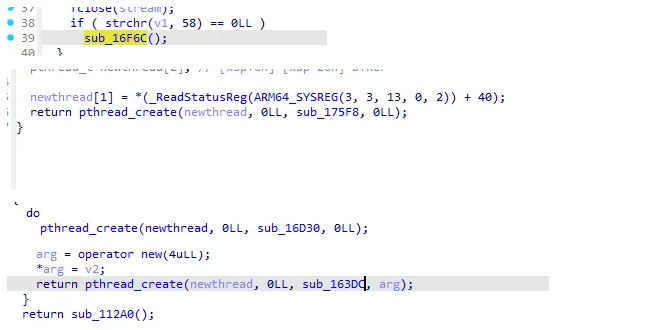 但是他具体的混淆,就在与使用pthread_create加载反调试函数,这里就是sub_16D30和sub_175F8,再往里面走还有一个pthread_create_sub_16D30