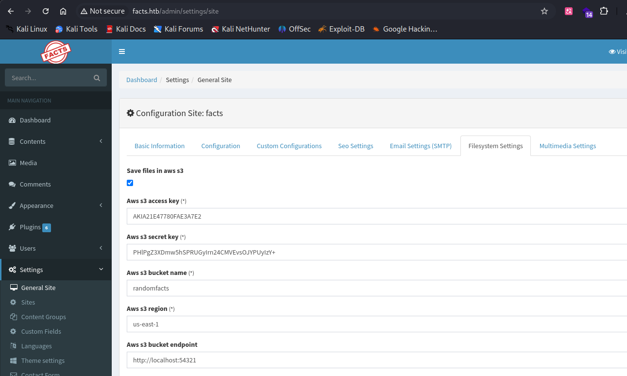 mc alias set HTB http://facts.htb:54321 AKIA21E47780FAE3A7E2 PHlPgZ3XDmw5hSPRUGyIrn24CMVEvsOJYPUyIzY+ 可以在储存桶里面翻到ssh的秘钥