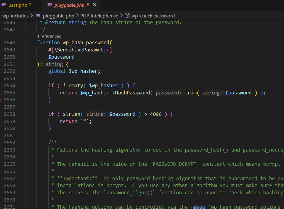 awk '!seen[$0]++' pass.txt > newpass.txt //直接进行顺序去重清洗完后剩下10万条,可以考虑用hashcat爆破,不过目前hashcat没有专门针对wordpress新版本的哈希模式,我们先看看新版本的wordpress的密码哈希是怎么进行计算的,在源码中找到这个wp_hash_password函数.