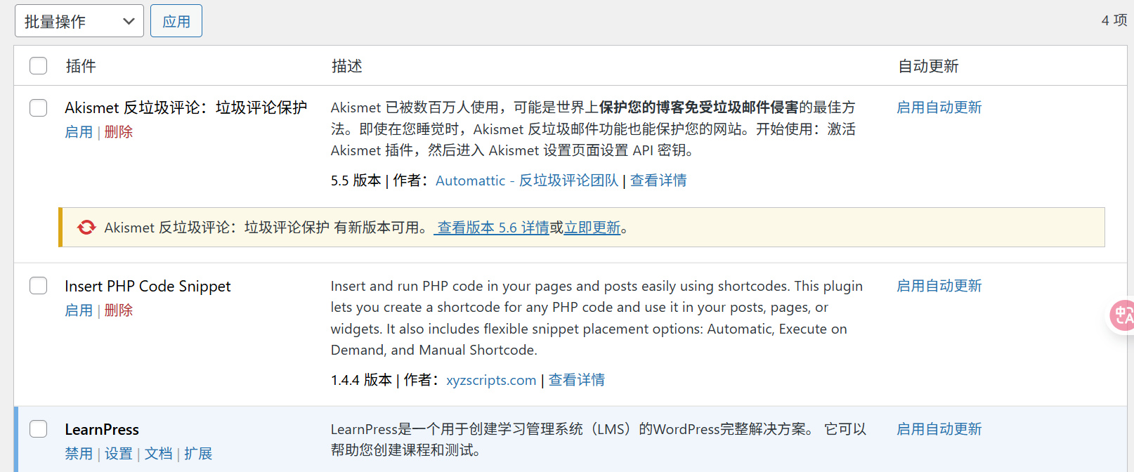 用爆破出来的明文进后台,发现用wordpress的各种rce姿势都不行,这个屑站长直接给管理主题和插件的目录都设置了可读不可写,太坏了.这种估计就是做前端站,比如说一些学校、企业的官网,不需要太多用户交互的功能在站搭好后就直接给目录锁了,就算通过什么手段进入了后台也很难实现rce,毕竟wordpress的洞特别多,特别是SQL的,然后管理员要么没有相关技术储备,要么很久不上线,导致很多插件漏洞出现的时候都难以实时更新.不过在已安装插件的地方发现了一个未被启用的插件Insert PHP Code Snippet