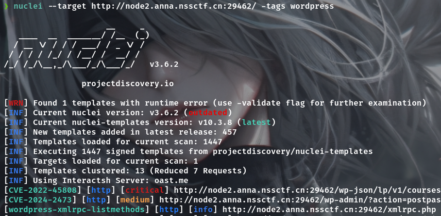 nuclei --target http://node2.anna.nssctf.cn:29462/ -tags wordpress