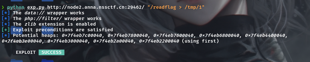 disable_functions = dl,exec,system,passthru,popen,proc_open,pcntl_exec,shell_exec,mail,imap_open,imap_mail,putenv,apache_setenv,symlink,link,phpinfo,set_error_handler,pack这里直接在插件里面注入以下php代码,然后用exp跑,需要下载pwntools库,有时候可能会炸,多执行几次就行